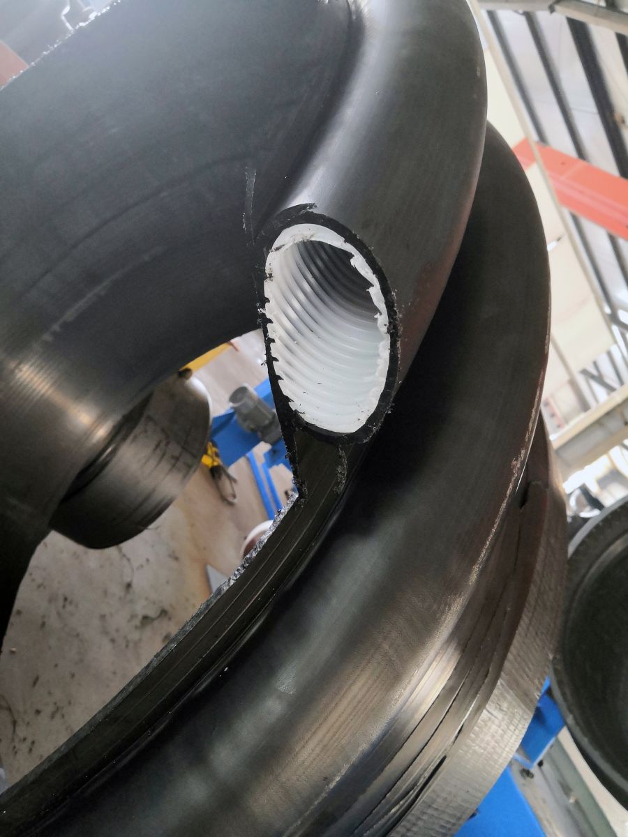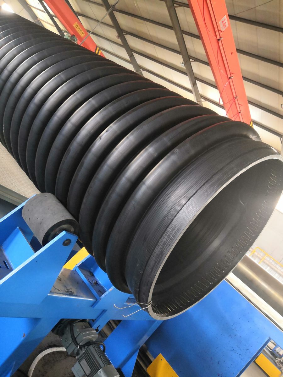 1.热态缠绕成型熔缝质量高 从挤塑机口模挤出的处于熔融状态的平料带和U型料带,按预定的位置均匀的缠绕在加热的滚筒模具上,*了结构壁管熔接缝质量。特别是结构设计中平料带的熔接缝被聚乙烯包覆支撑管所覆盖,提高了制品整体的抗外压能力